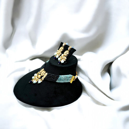 Gold plated kundan choker set with blue beads