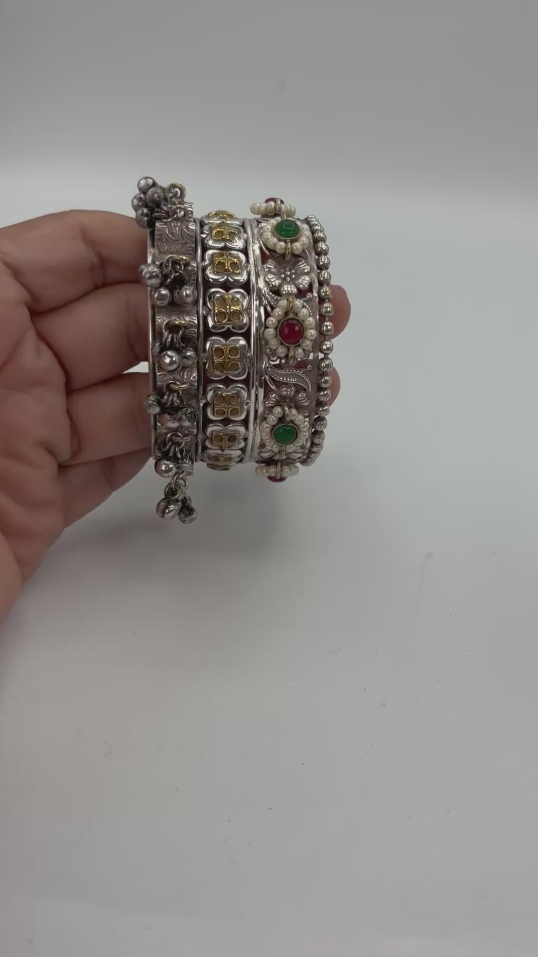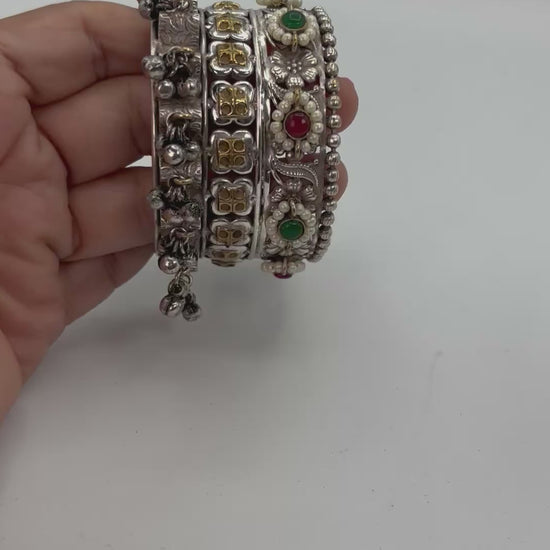 2tone broad silver adjustable kada with ghungroo and red , green stones.