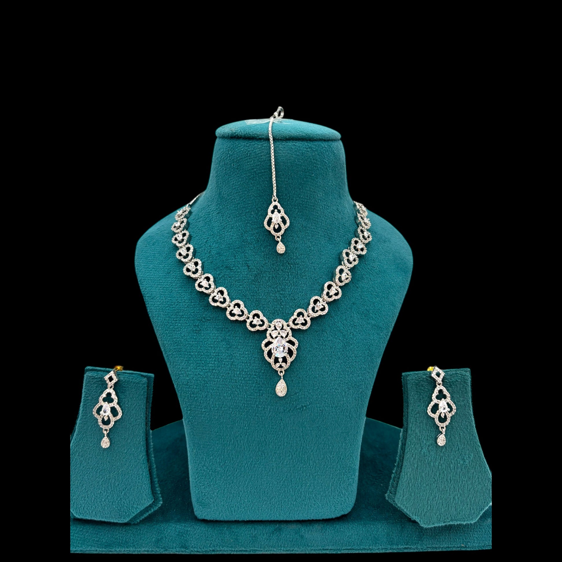 Silver tone American Diamond necklace set with matha tikka and earrings.