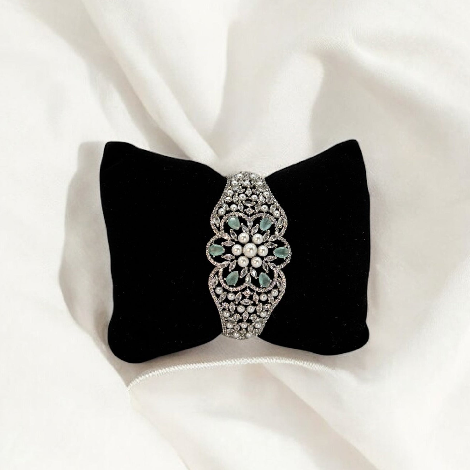 Beautiful design silver tone American Diamond openable bracelet with pastel green stones and white pearls.