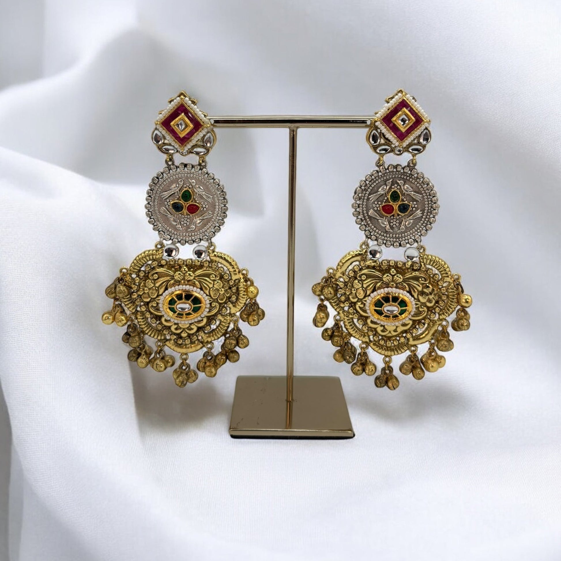 Beautifully carved handmade dual tone pachi kundan jhumki.