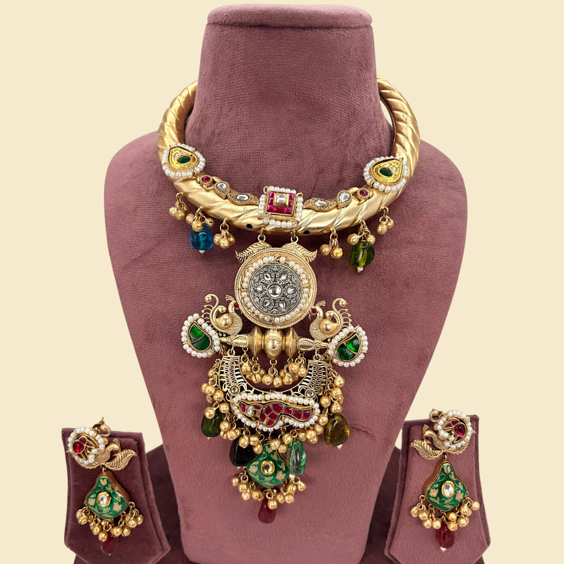 Gold plated beautifully hand crafted fusion pachi kundan statement hasli with earrings.