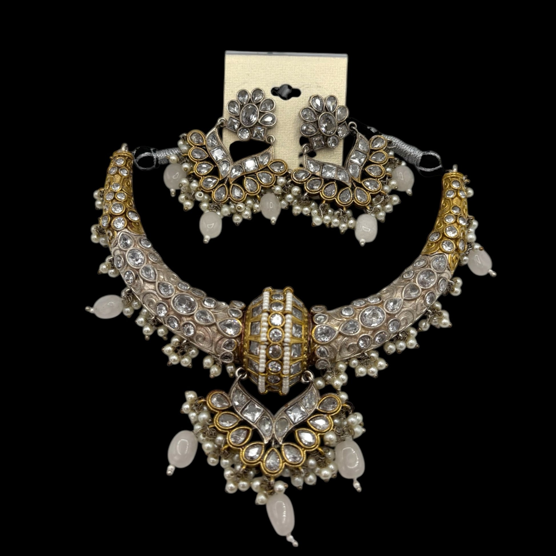 Contemporary gold and silver hasli style necklace set with uncut kundan and white stones.