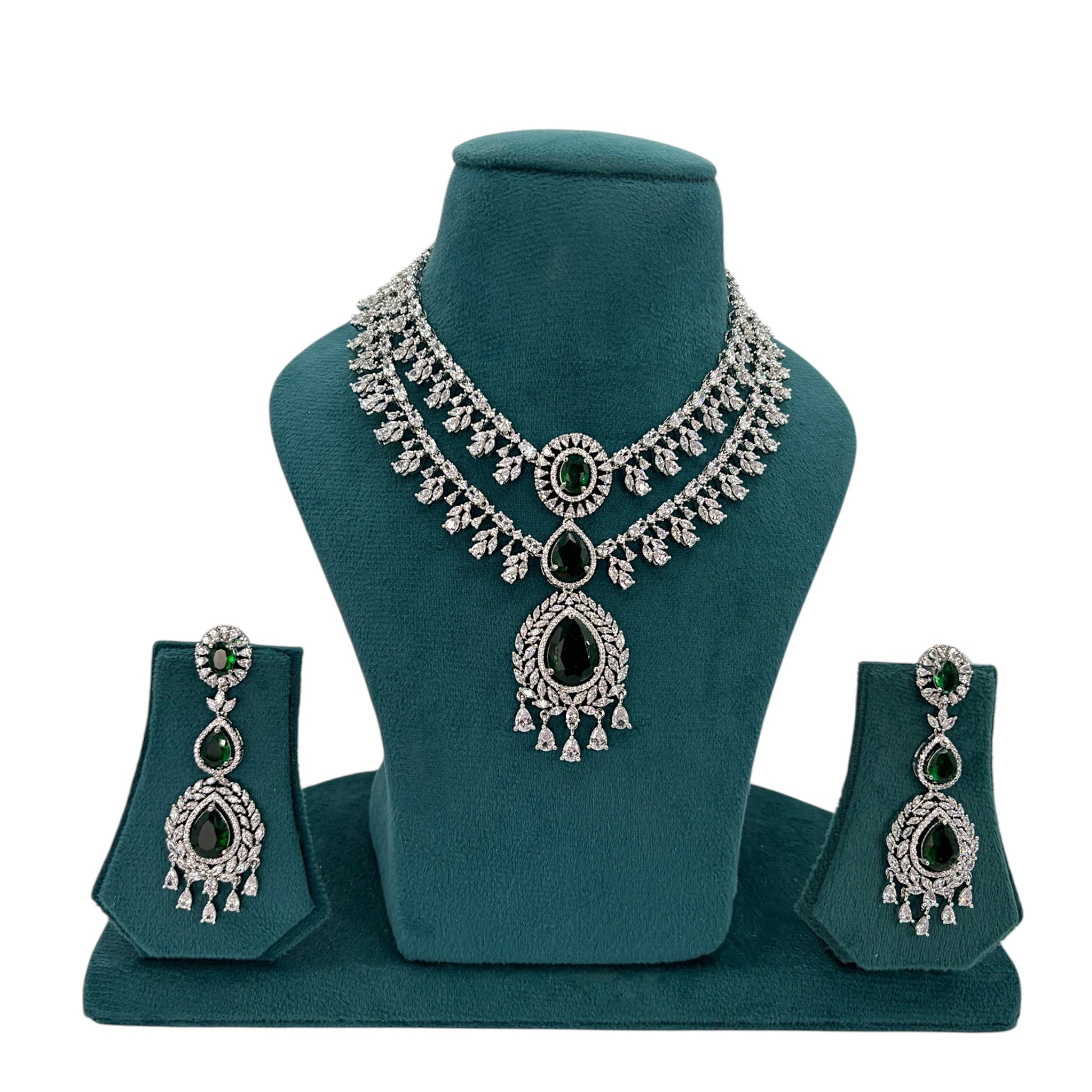 Silver plated Premium quality American Diamond two strands emerald green necklace set.
