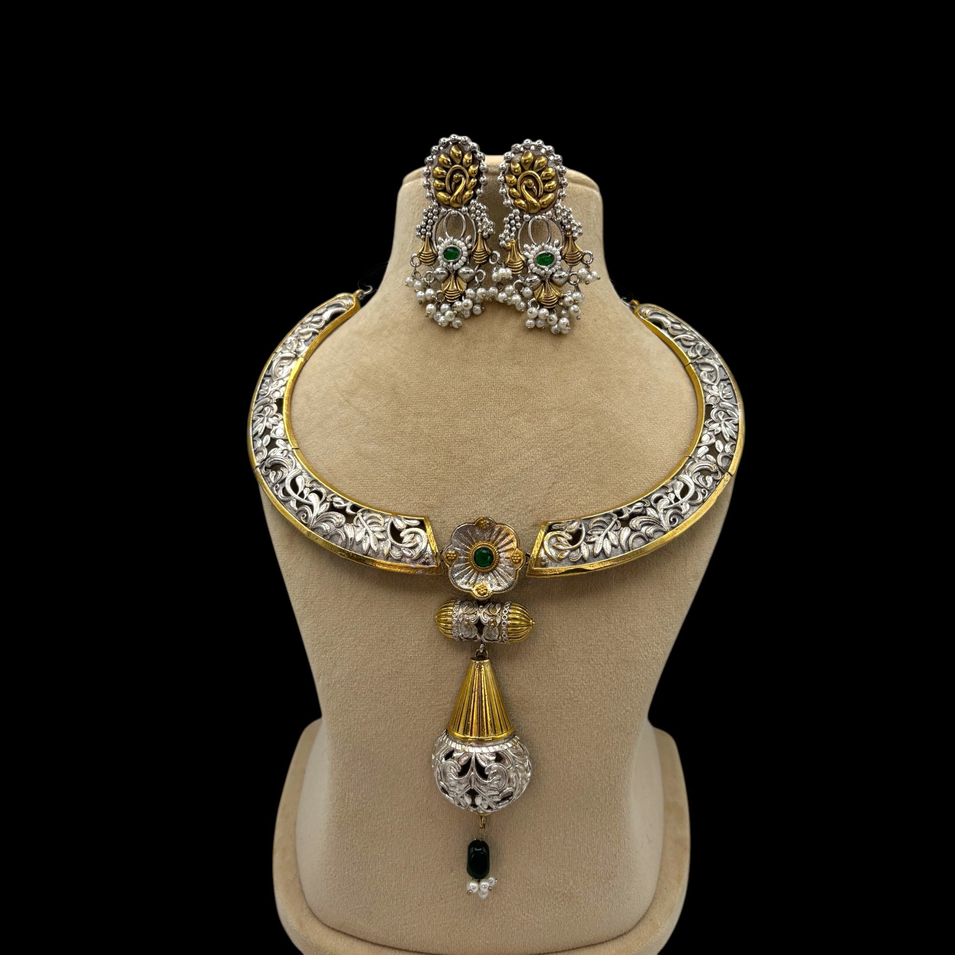 Gold and silver plated beautifully carved fusion adjustable hasli style necklace set with earrings.