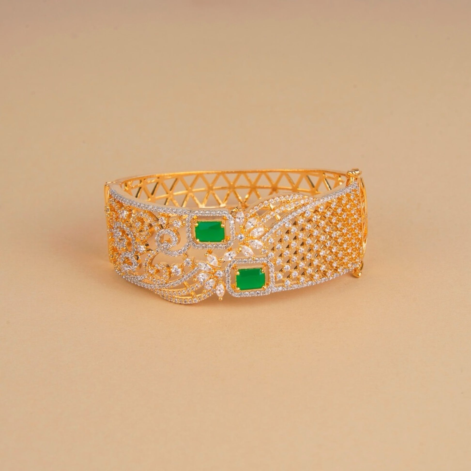 Gold plated American Diamond openable bracelet. Available with green and blue stones.