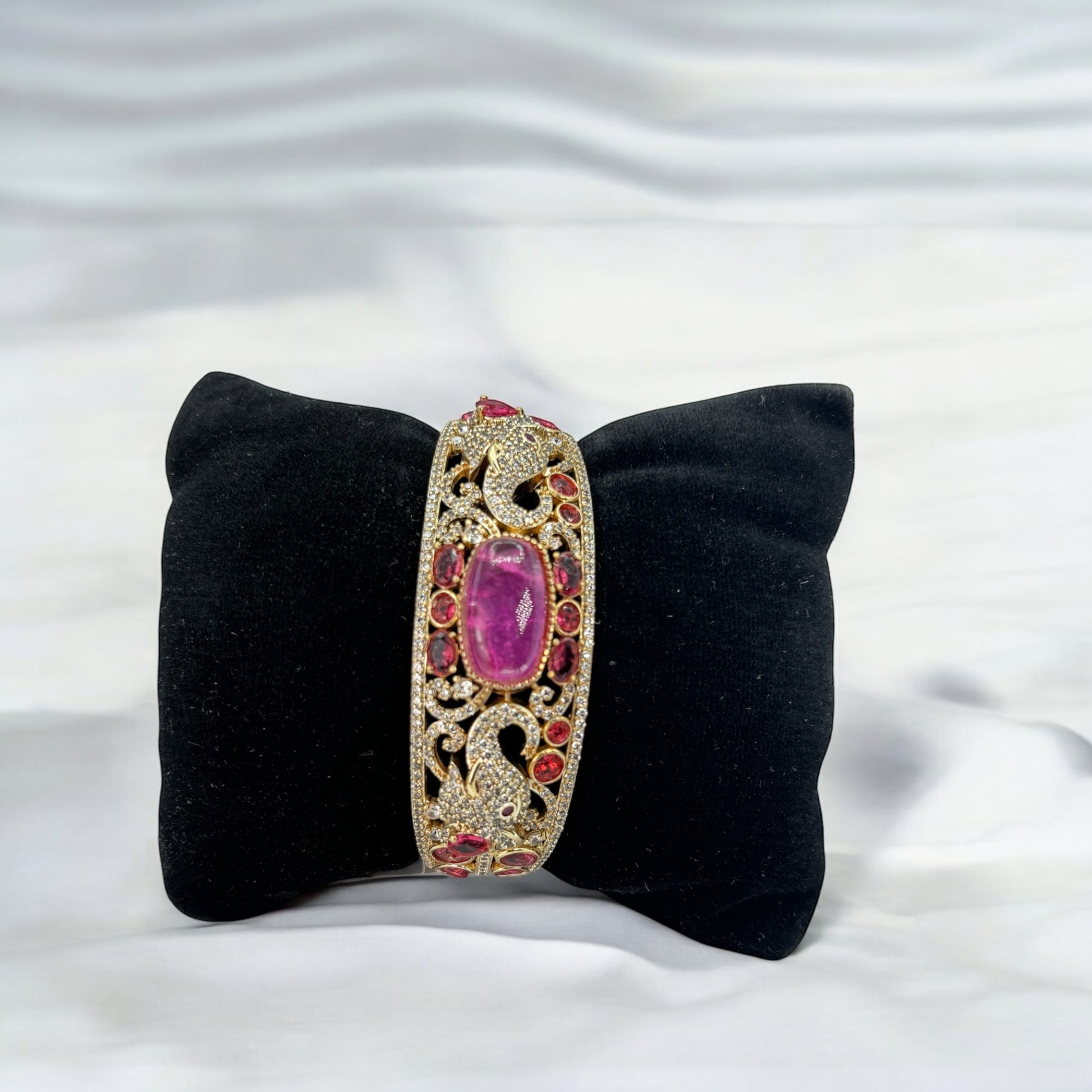Gold plated beautifully crafted openable bracelet with red and pink stones .