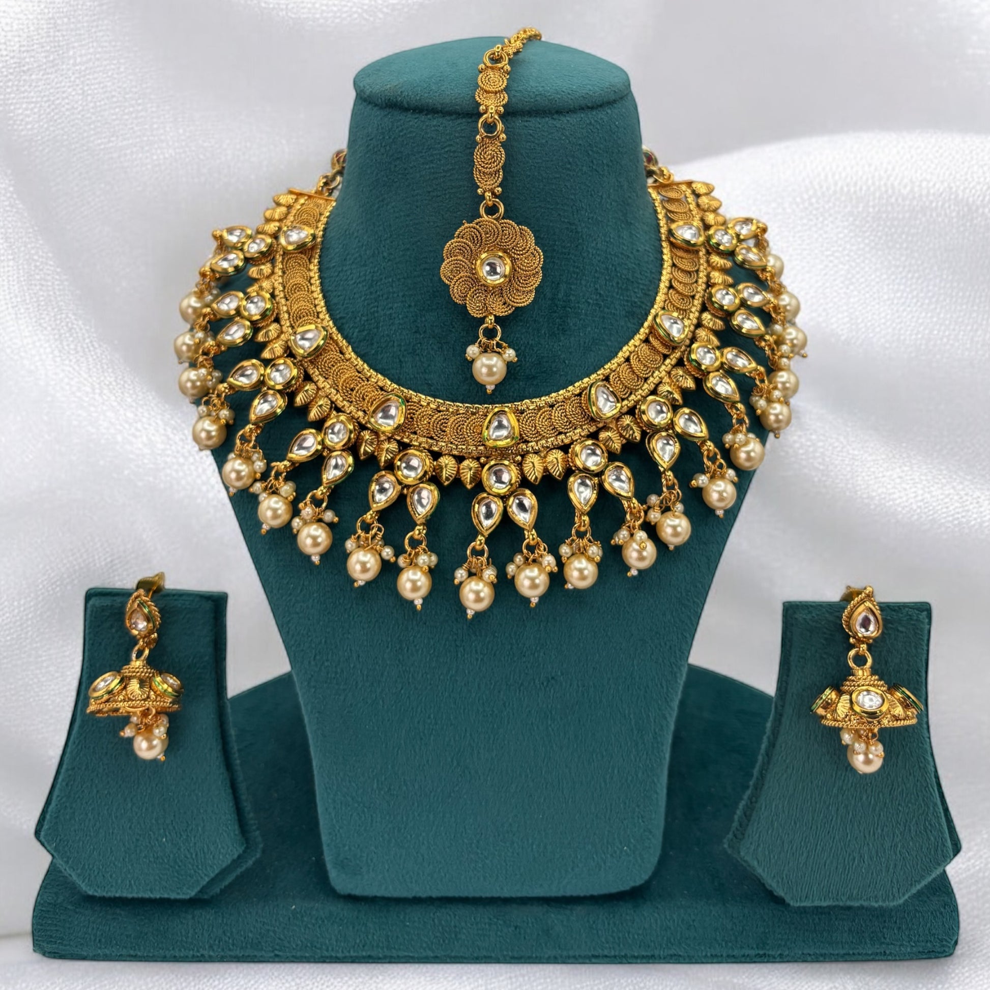 Gold plated kundan necklace set with white beads and matha teeka.