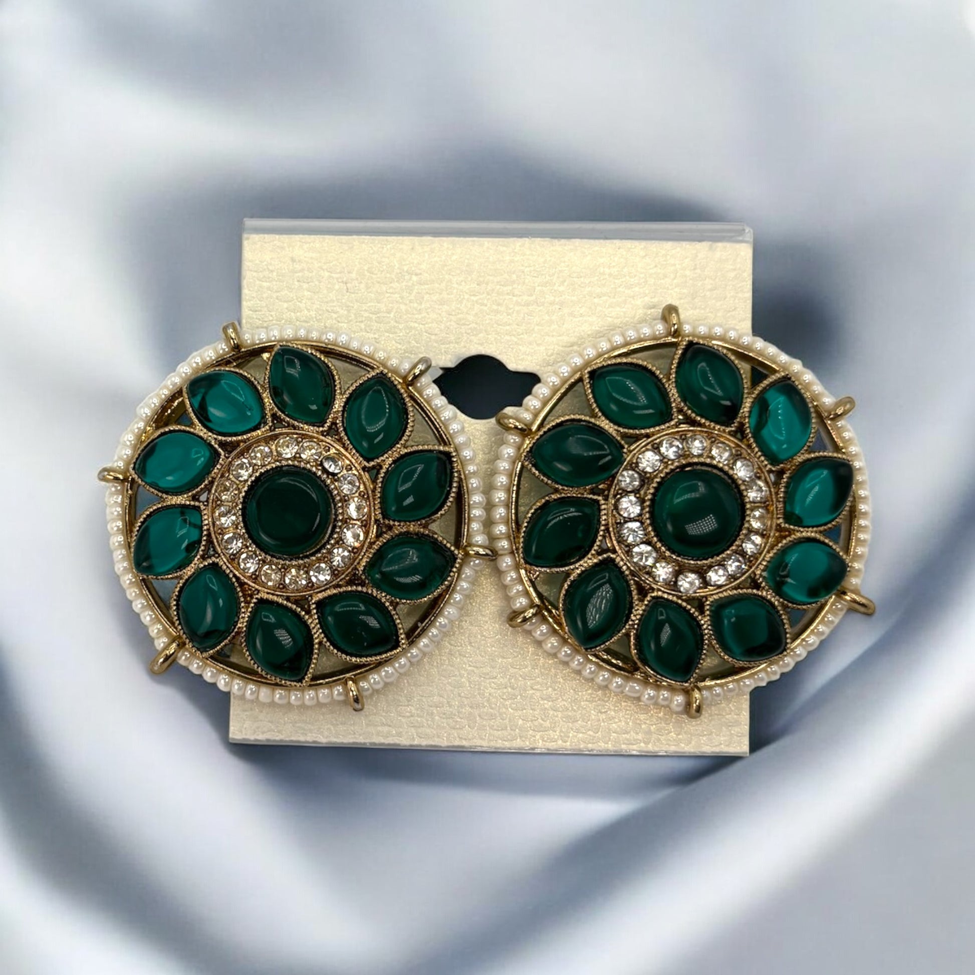 Gold plated big studs with green stones, American Diamonds and pearls.