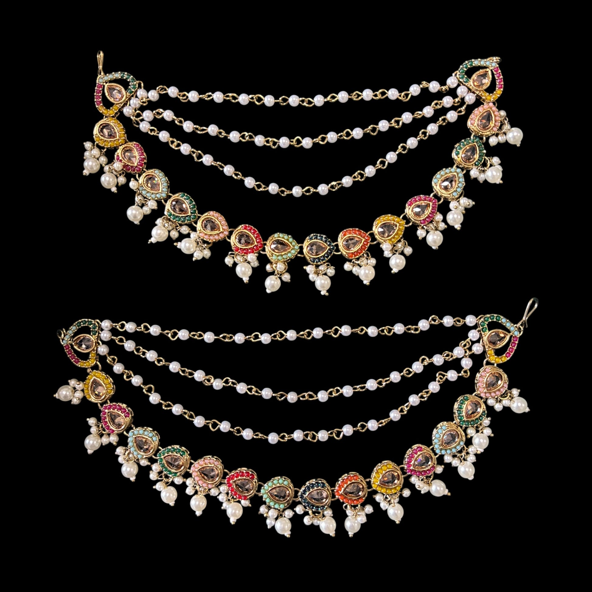 Mehndi polish four layer ear chain with multi color stones and moti.