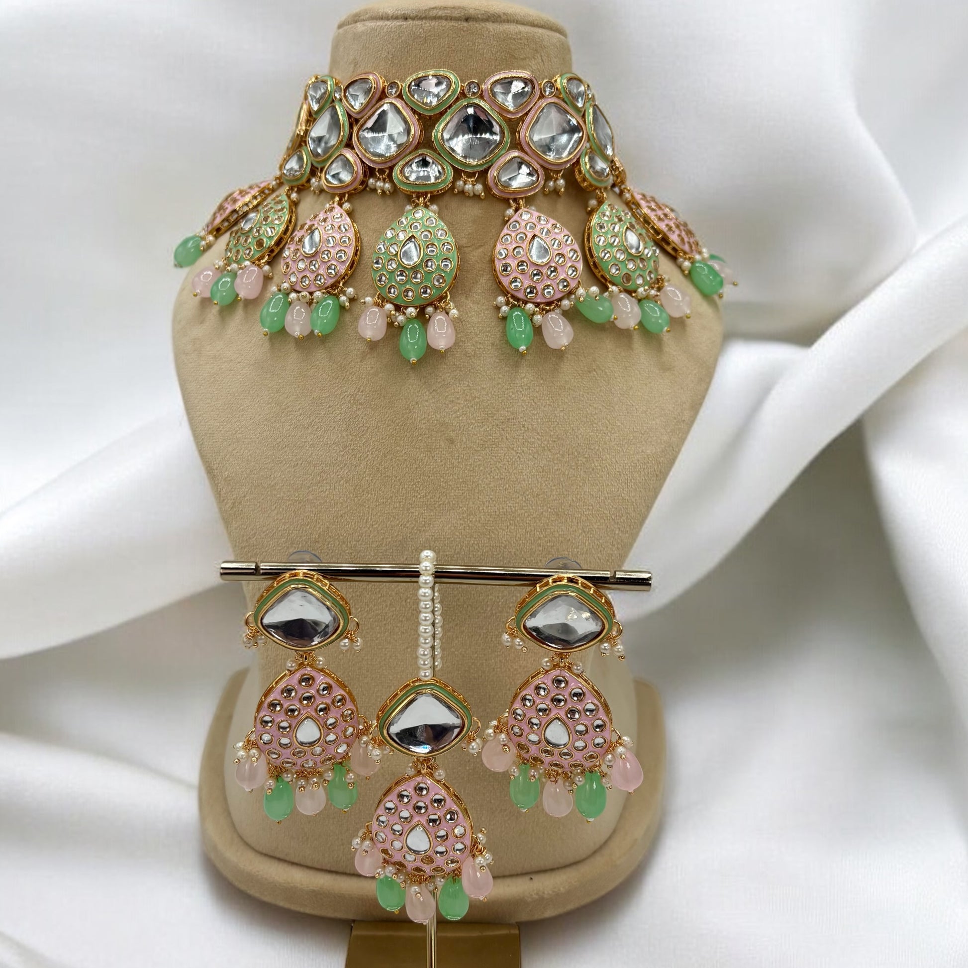 Pastel pink and mint colour choker set with earrings and mang tikka.