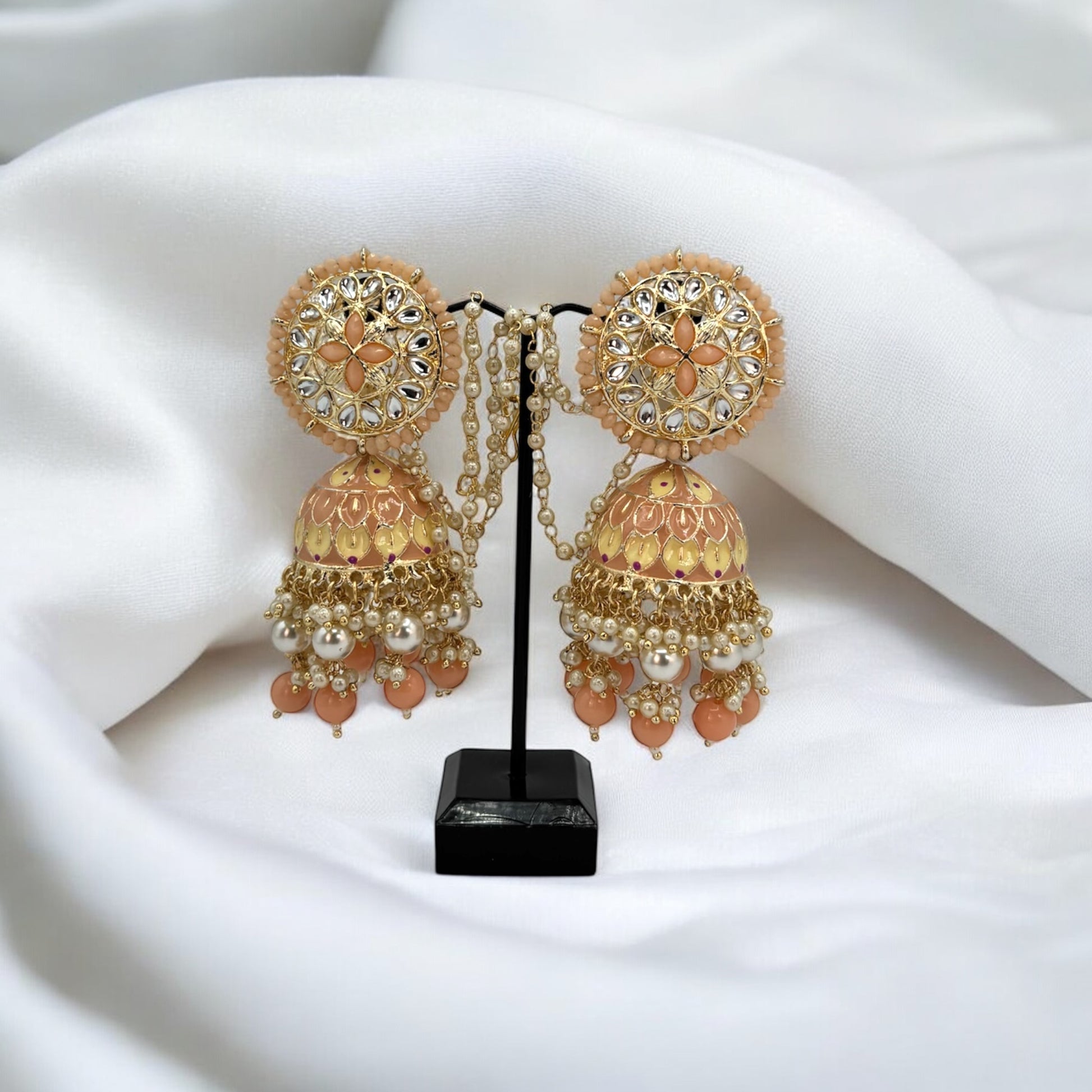 Peach color enameled jhumki with kundan stones and sahara/ear chain