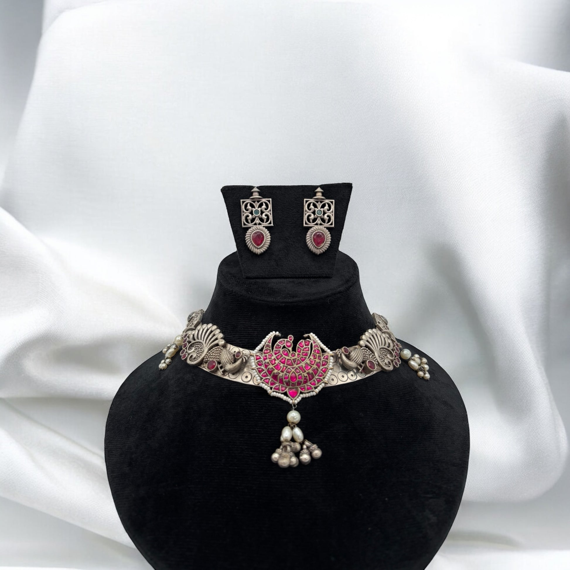 Peacock design solid German Silver hasli set with pachi kundan.