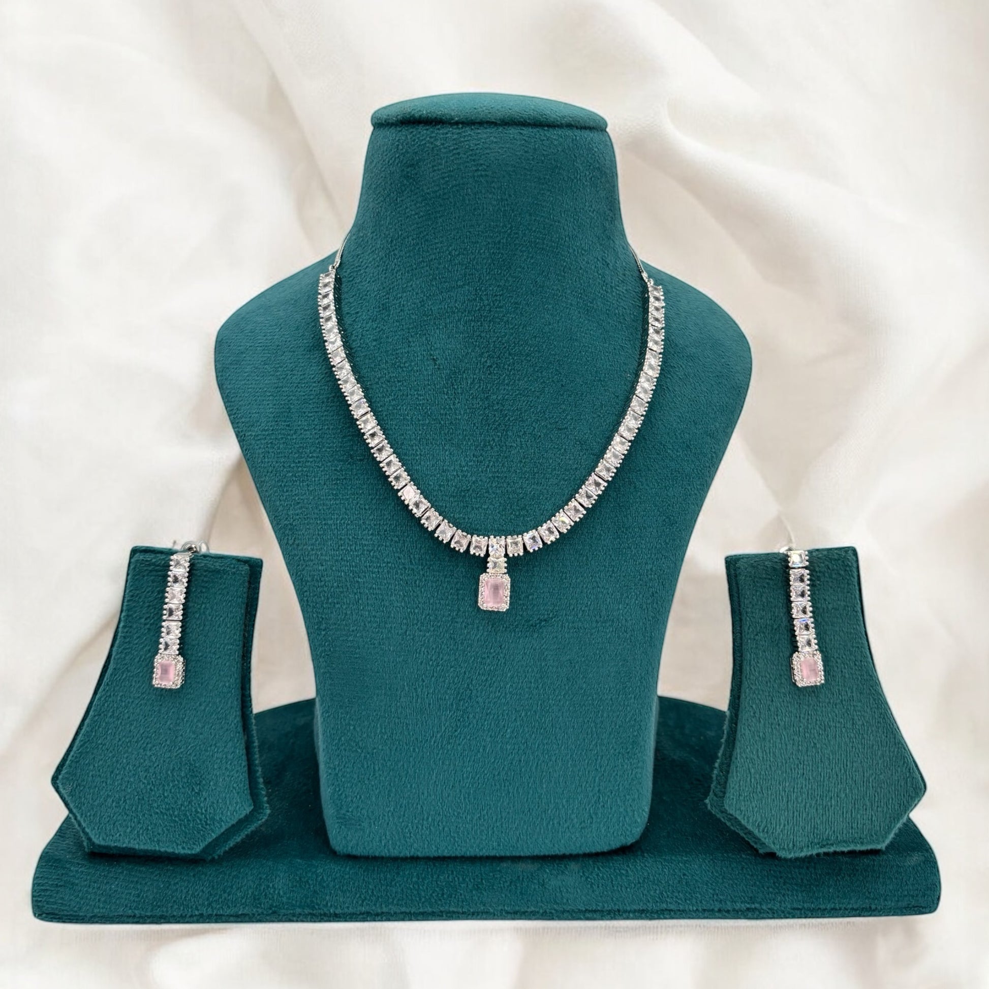 Silver American Diamond necklace set with pink stones.