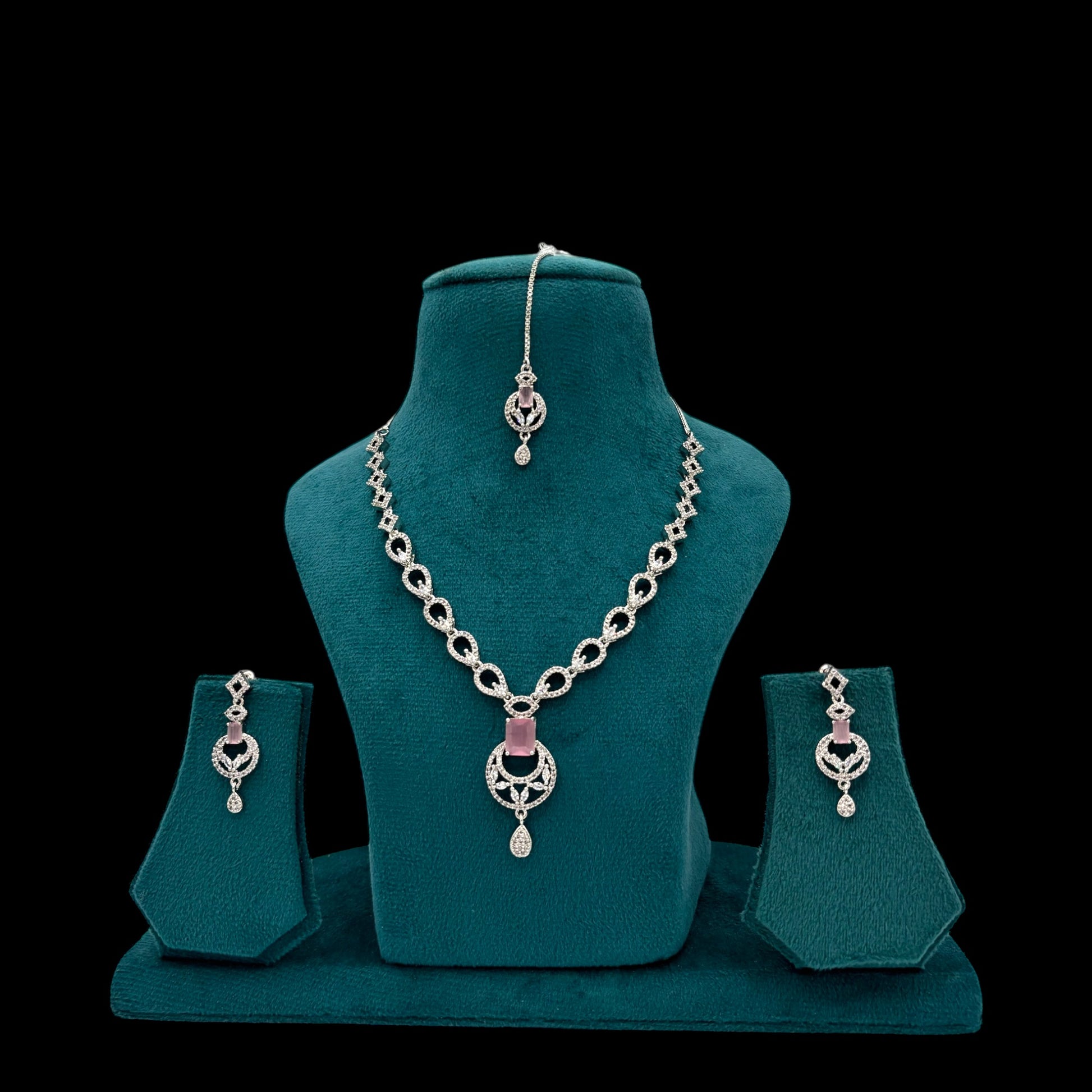 Rhodium plated pink American Diamond necklace set with matha tikka and earrings.