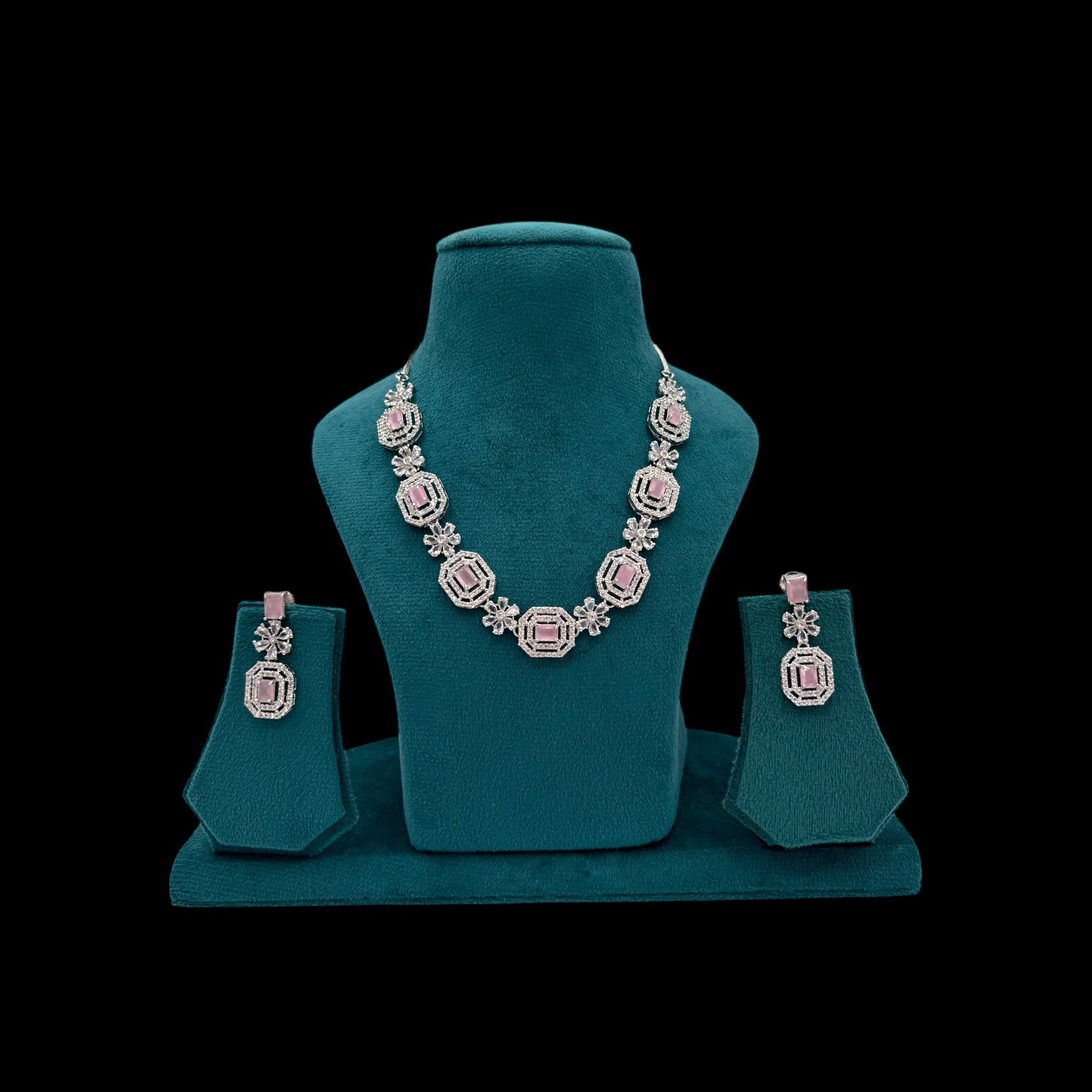Pink American Diamond necklace set with rhodium polish paired with earrings.
