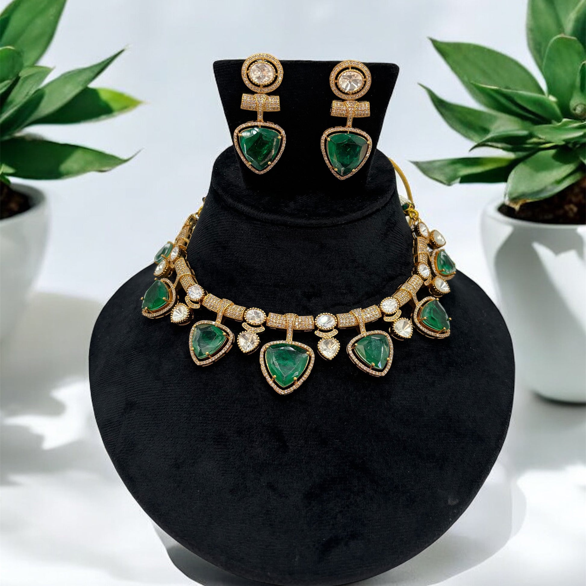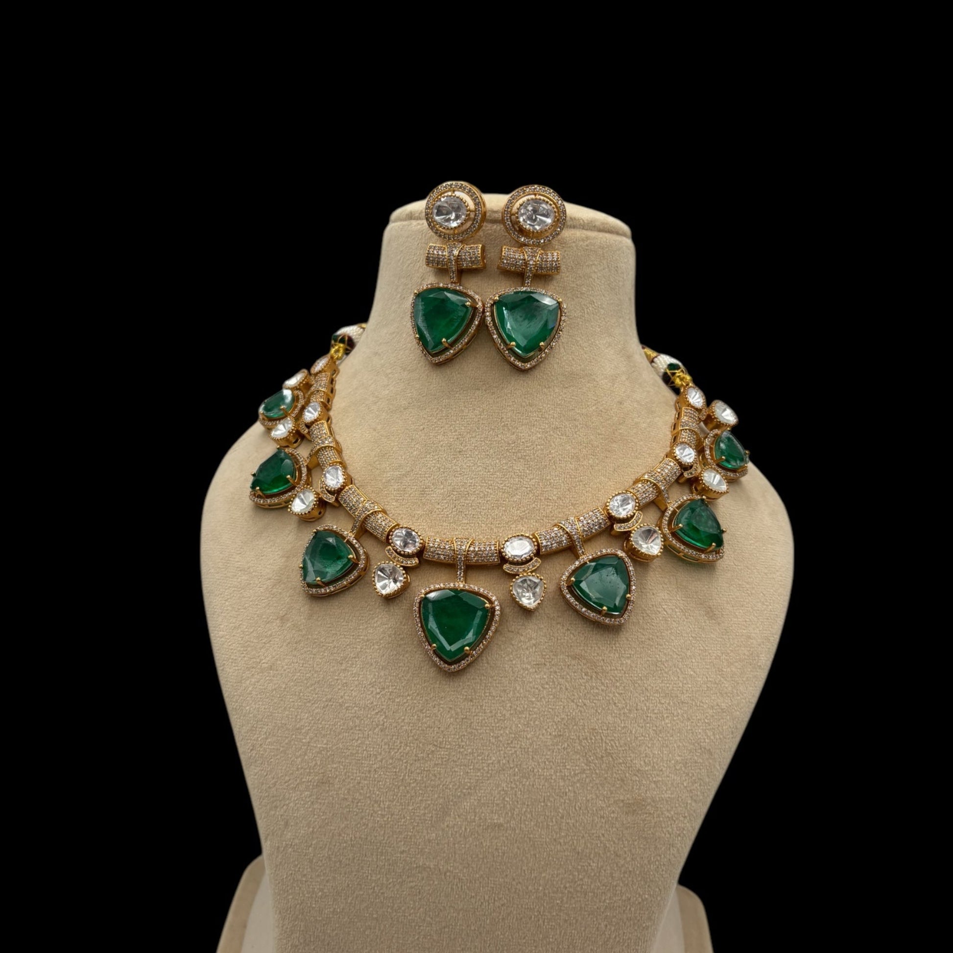 Premium quality gold plated kundan and mossanite necklace set with emerald green stones.