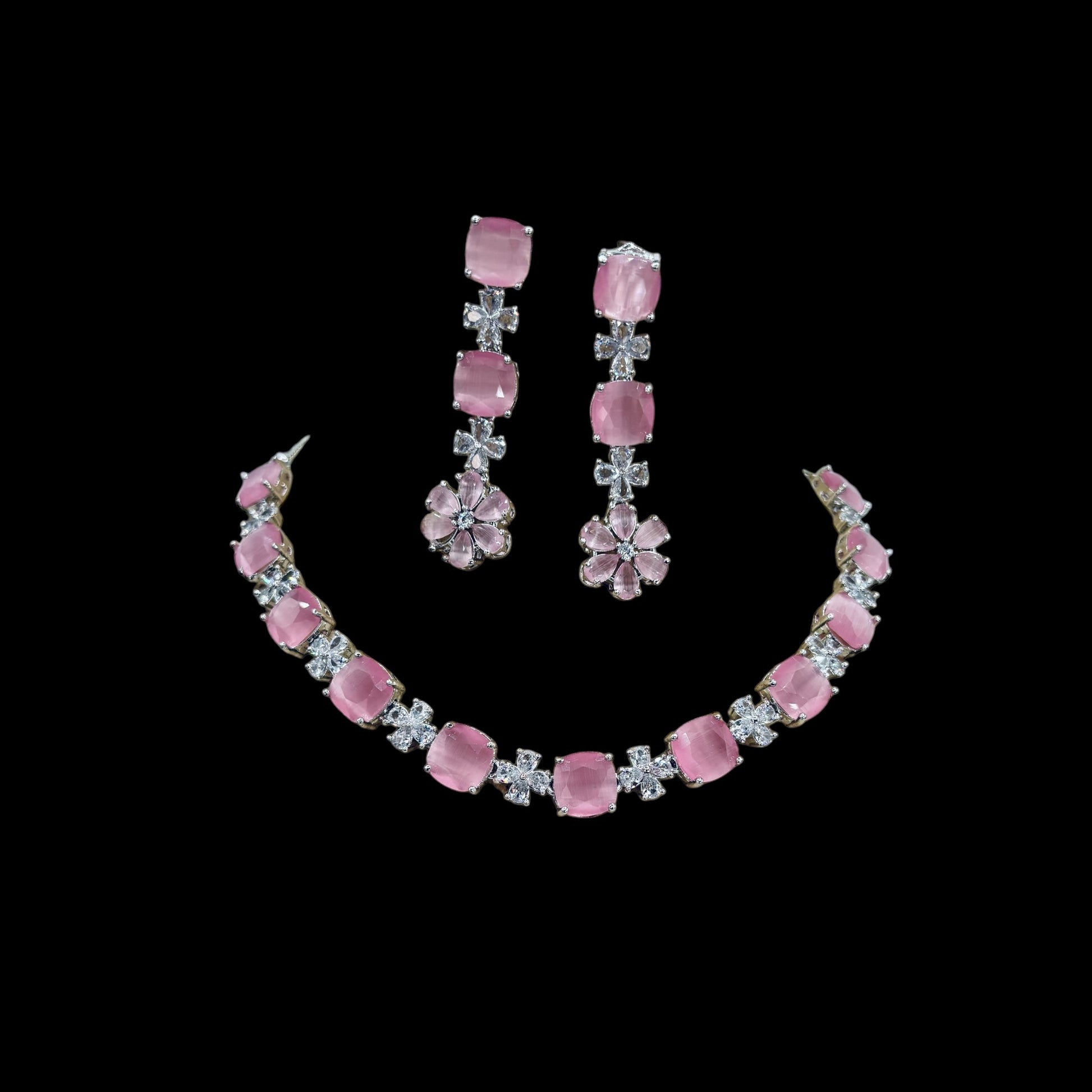 Rhodium plated pink American Diamond necklace set with earrings.
