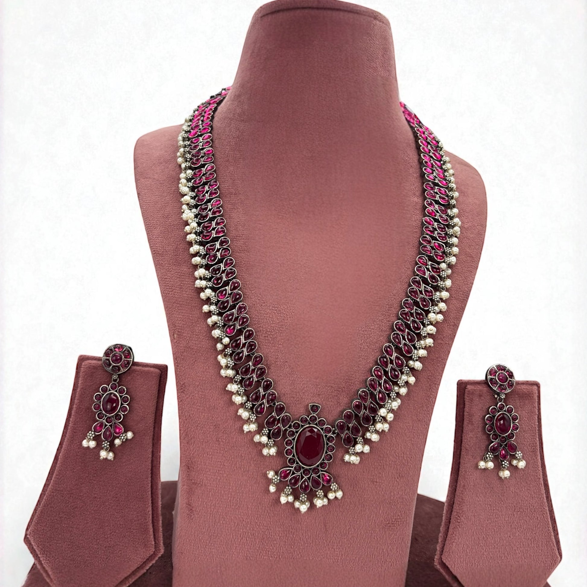 Long necklace set with silver oxidized plating and dark pink stones.