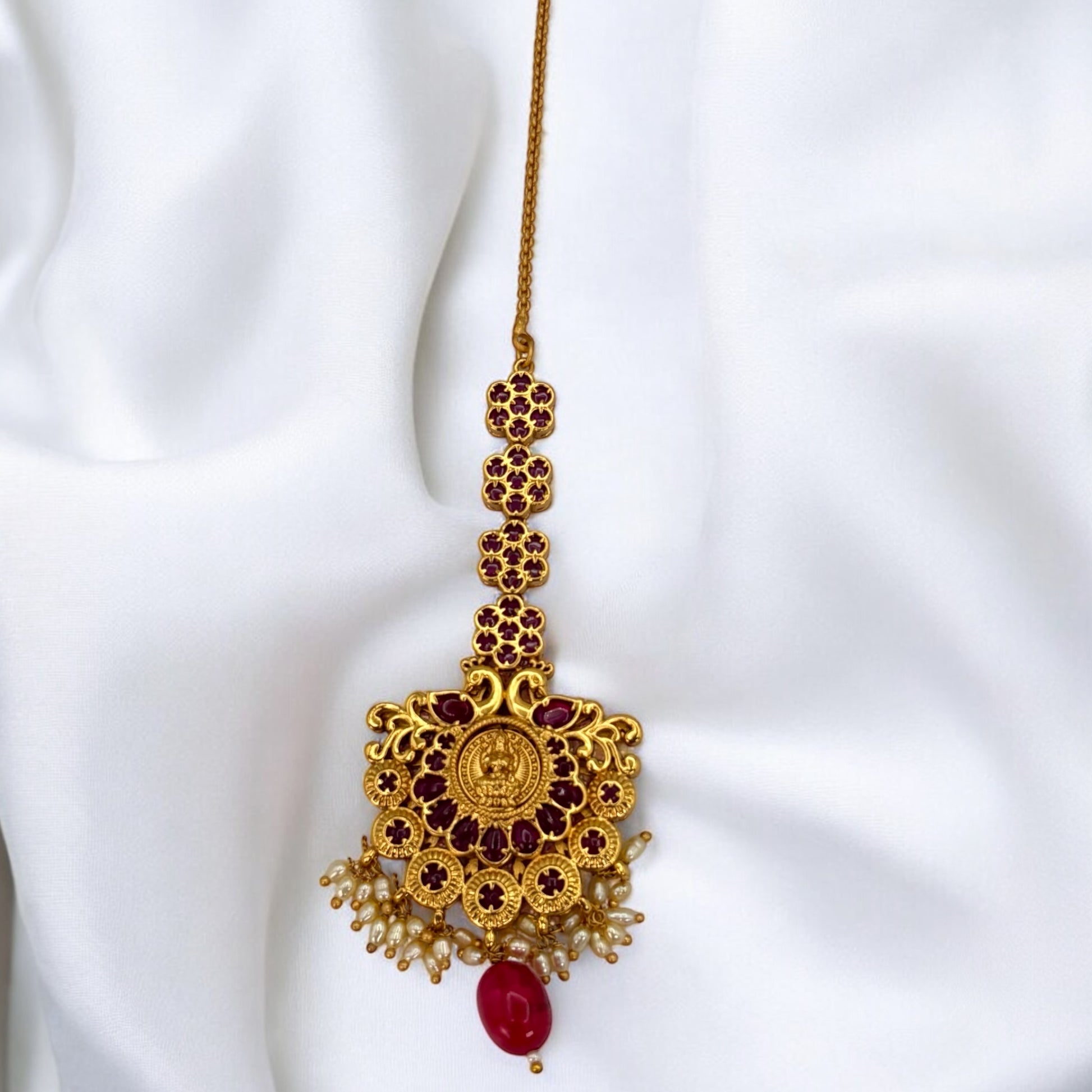 Gold plated temple matha tikka with dark pink/ruby stones.