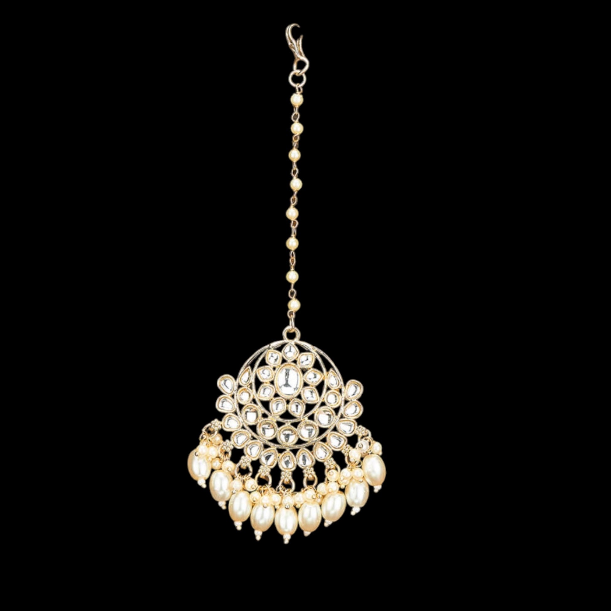 Gold tone white mang tikka.